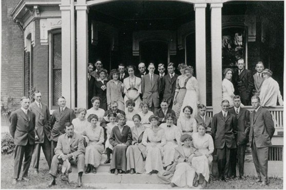 Alumni, spouses, members, and girlfriends of Iowa State College Sigma Nu Fraternity and their spouses gathered at the fraternity house at 905 Douglas Avenue. The house had been the former residence of George G. and Lydia C. Tilden and their children. In 1904, it became the house of the Sigma Nu chapter that had just formed at Iowa State College.